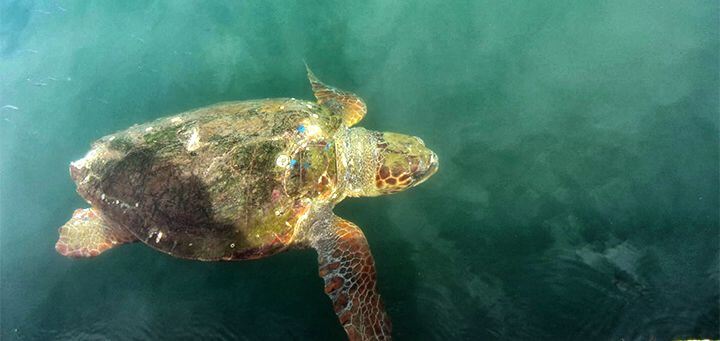 The Loggerhead sea turtles (or also known as Caretta-caretta) are the only marine turtles nesting in Greece and the Mediterranean. They can be distinguished from other turtles by their large heads, reddish-brown shells and yellow/brown skin, while they are considered to be one of the oldest species in the world. An adult Loggerhead grows to a length of 1.0-1.2m, weights between 100-350 kg and can live for around 65 years.
